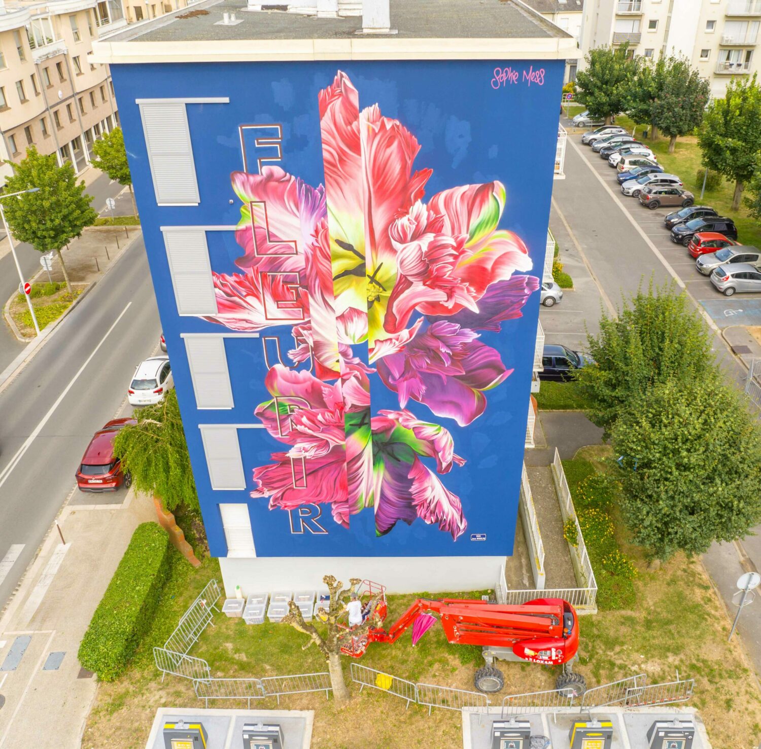 Sophie Mess insuffle une énergie vibrante aux espaces urbains à travers ses fresques murales botaniques, où fleurs surdimensionnées, oiseaux et mots inspirants prennent vie. Son travail célèbre la nature en milieu urbain, invitant à la contemplation et à une nouvelle perception du monde naturel. En fusionnant couleur et imagination, elle transforme la ville en un jardin visuel propice à l’évasion et à l’émerveillement.