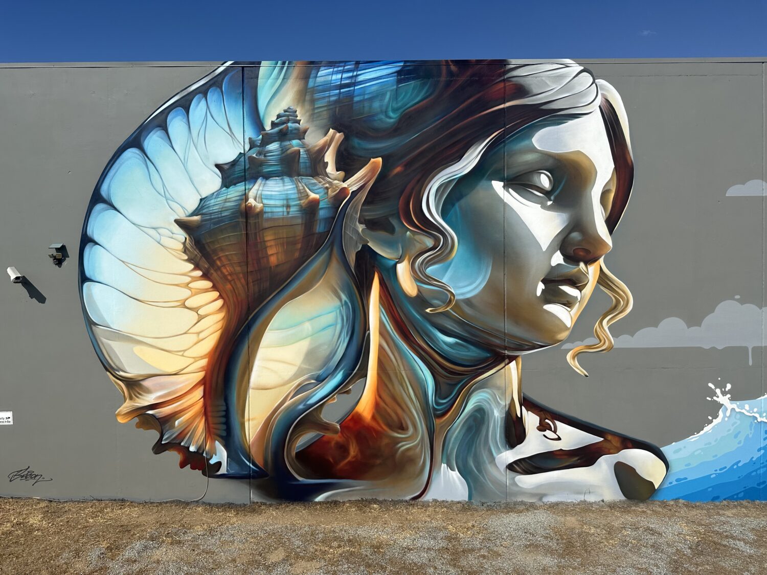 Pour le Concrete Canvas Festival d’Hamilton en juillet 2022, il réalise la représentation d’une créature futuriste à l’aspect métallique flanquée d’une coiffure exubérante de fleurs aux couleurs pastel. Une composition à l’aspect unique -sorte d’Iron Woman ?- tout en contraste dans lequel l’opposition des textures comme des matières et des couleurs donne à l’ensemble une apparence des plus originales.